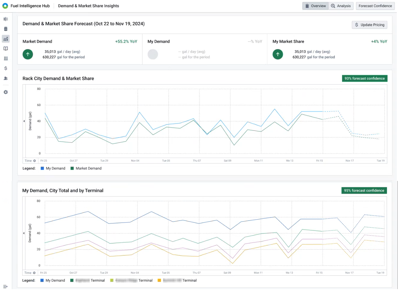 The Demand & Market Share Insights page enables you to quickly understand market movements down to the regional and terminal levels.